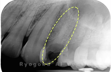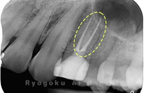 他院で細い器具(ファイル)が根管内に破折した状態で、咬合痛を主訴に来院された患者様です。ファイルをマイクロスコープ下で除去し、根管治療を行ないました。
